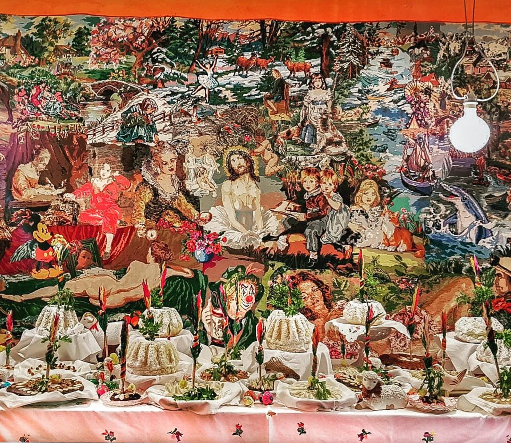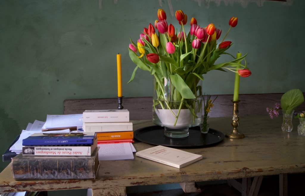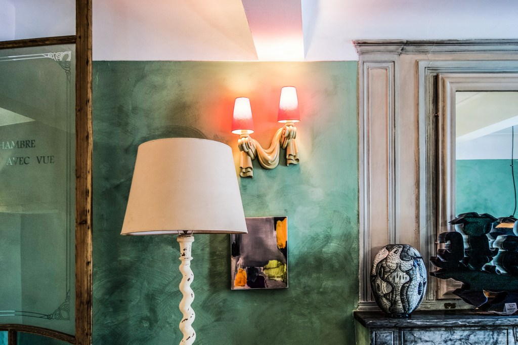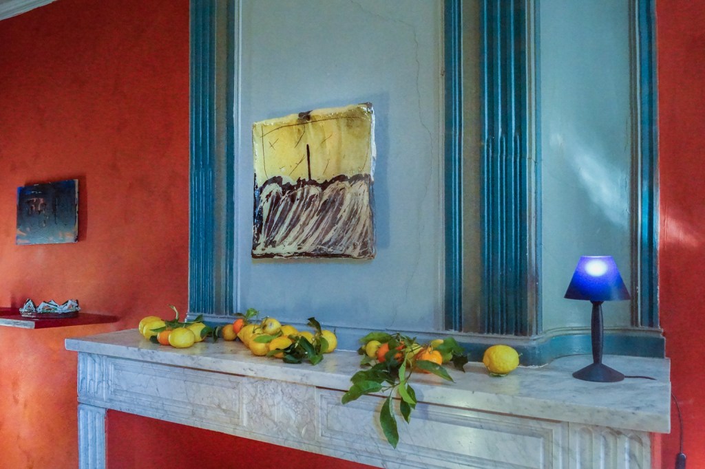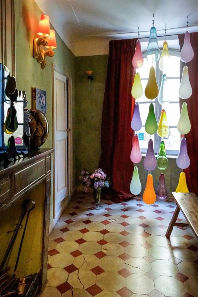 Artists work is celebrated on the walls, the furnishings are rich and eclectic. A vast basket filled with artichokes – to be admired for their sculptural form is destined to be a delicious appetizer. Avocados grown by a friend in Nice mingle with lemons from a Marseilles garden in a ceramic bowl with the proportions of a giant fantastical crown. There are flower arrangements everywhere – some monumental – others just a single bloom on a mantle and all are all works of art.