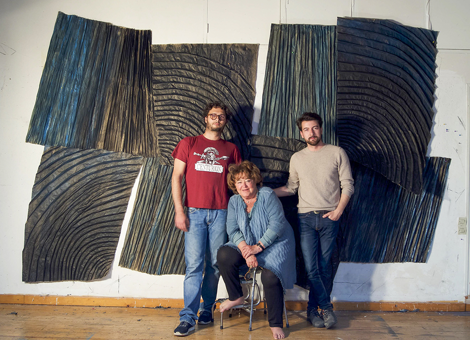 Jagoda Buić with her assistants the artist Velimir Tucakov and producer Luka Jerkovic at work in the studio on collage with paper and ink and left “Japan 11”.