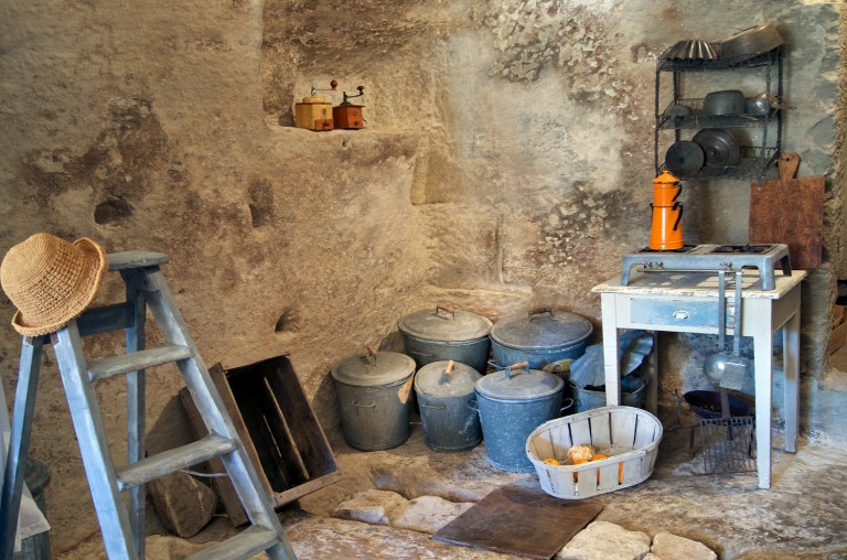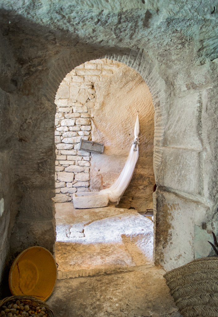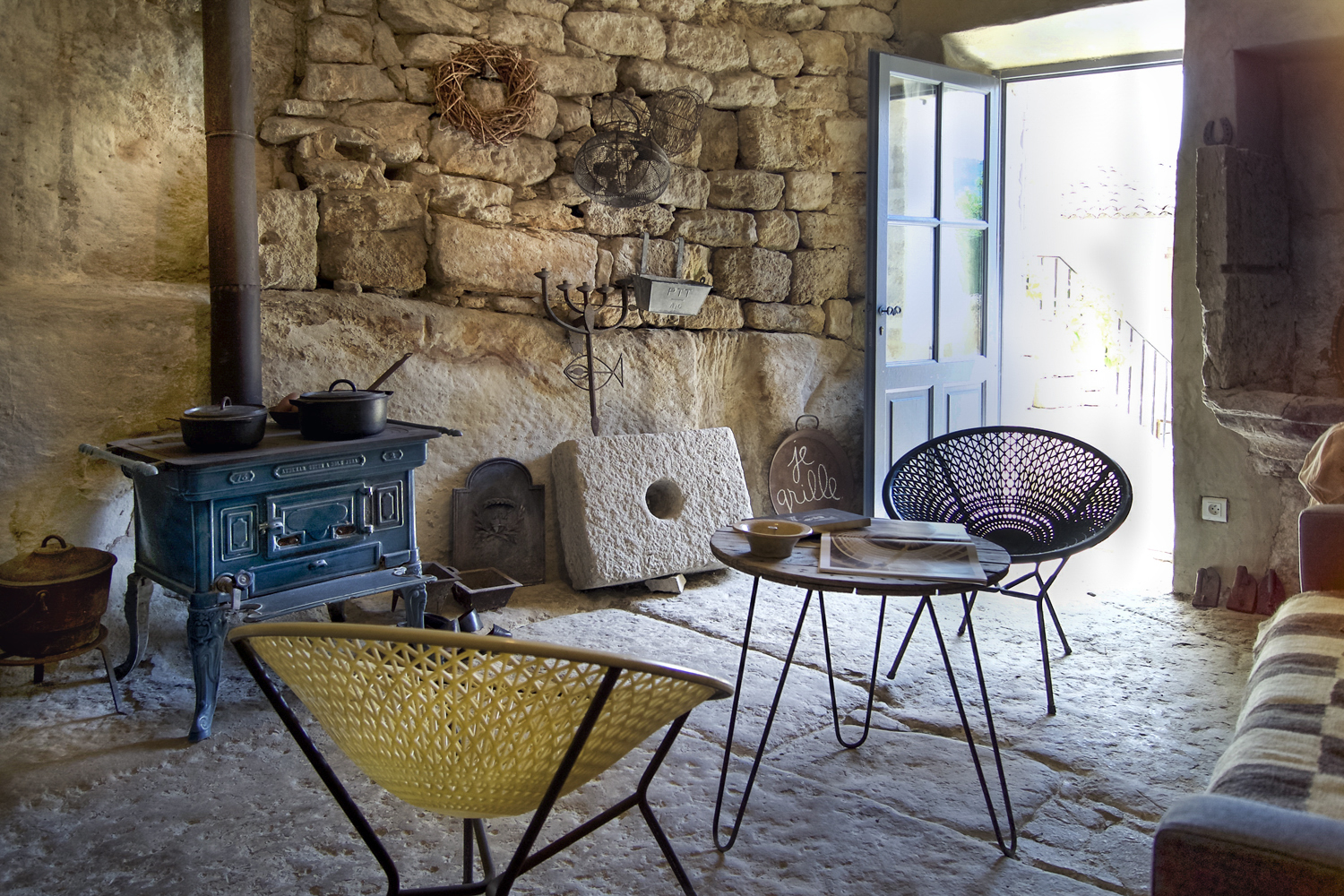 The three story house was created by joining two Troglodite houses, carved out of the limestone hillside. The arched doorway between the dwellings is over a meter thick. Huge stones found too large to move are used as decorative elements on the ground floor. The rez-de-chaussée is a neolithic cave. The upper floors were added in the 17th and 18th centuries.
