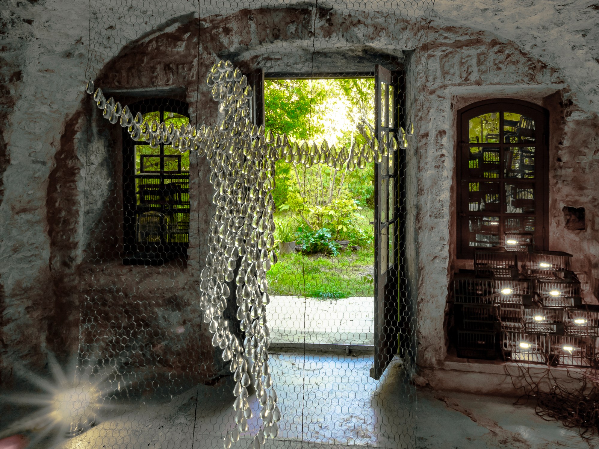The entry to her gallery in the Goult house with an installaion of caged lights on gold wires created for an exhibition at Mathieu Lusterie Gallery, Gargas, Provence