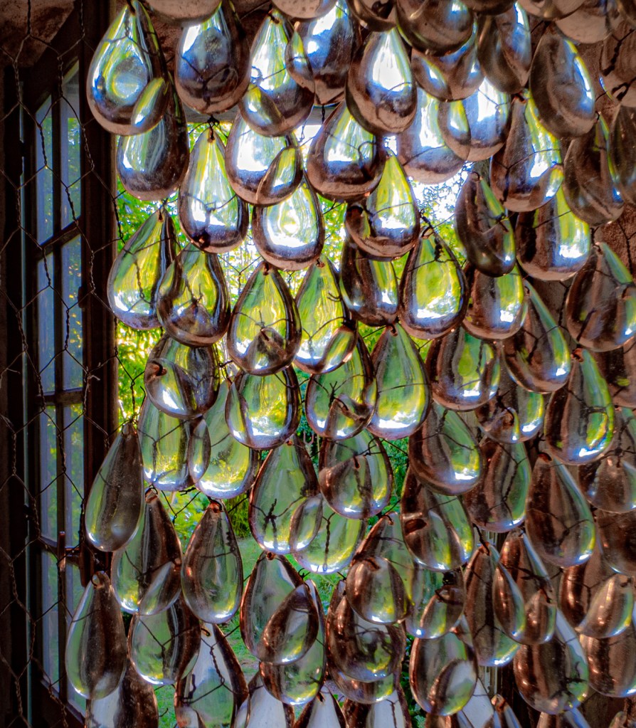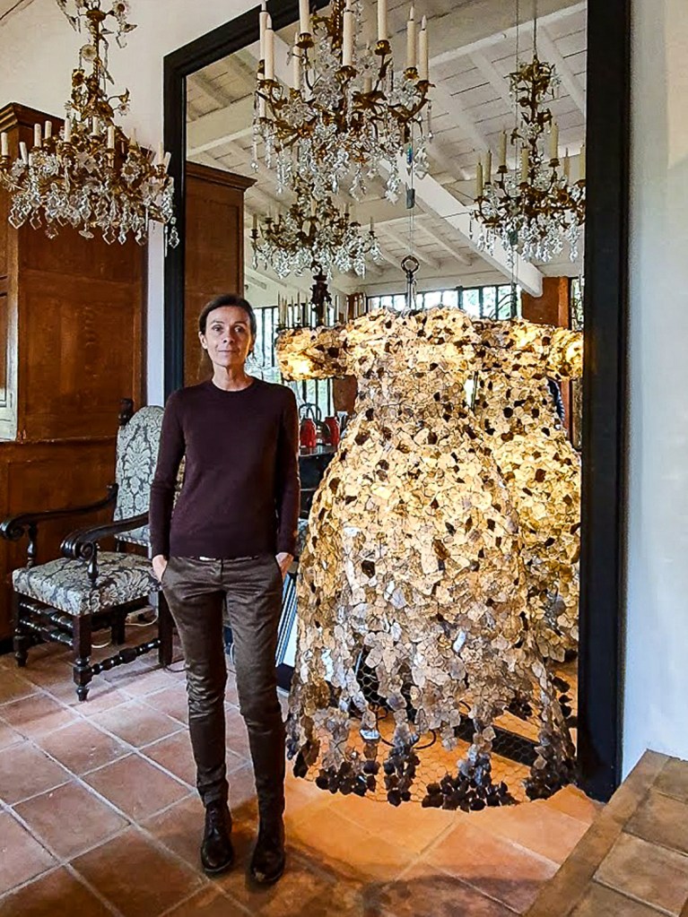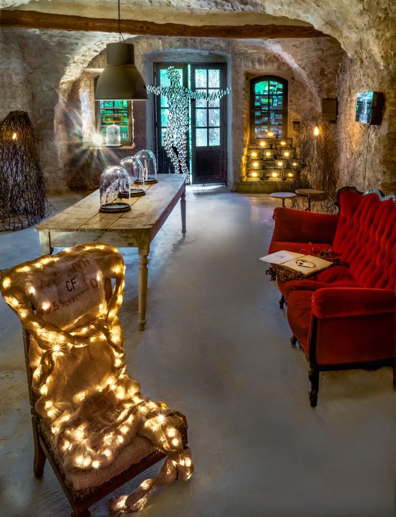 Les lumières scintillantes sur le tabouret de prière est une forme humaine faite de sacs en toile de jute, antiques animés de guirlandes lumineuses, présentée lors de l’exposition 2015 “Sur le Fil” au centre d’art Campredon à l’ Isle sur la Sorgue ; les globes sur la table de ferme protègent des sculptures miniatures en fil de fer; et la pièce de résistance est un “fantôme de cristal”, une pièce iconique, qui plane aujourd’hui sur le toit de sa maison à Menerbes. L’installation des cages à oiseaux est mise en valeur par un canapé en velours rouge du XIXe siècle dans la cave à Goult.