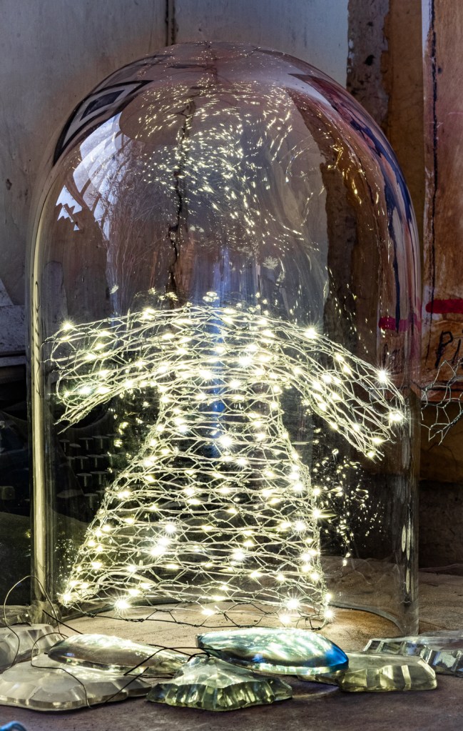 une œuvre en fil barbelé, cristal et fils de laiton dorés , et la petite robe lumineuse sous un globe en verre soufflé.