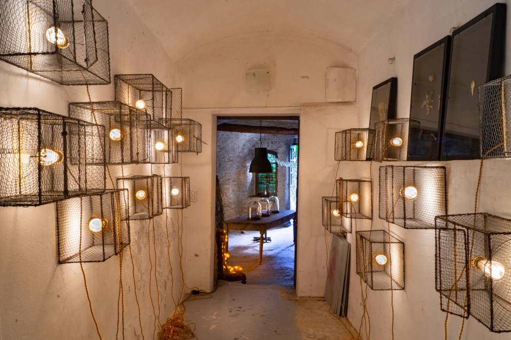 L’entrée de sa galerie à Goult avec une installation de nasses lumineuses créée pour un vernissage à la Lustrerie Mathieu, Gargas, Provence