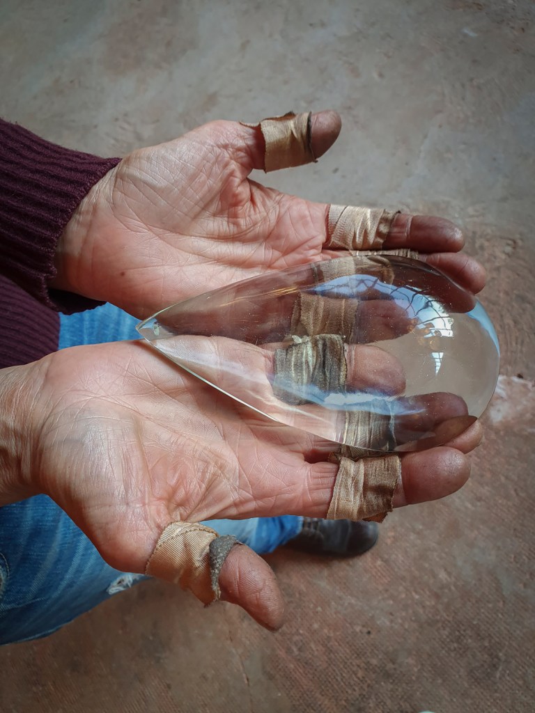 Christine et l’installation «L’ARBRE DE LARMES» à la galerie Mathieu Lustrerie, une histoire de verre… créations des gouttes de cristal en forme de larmes entre les mains de Christine, une forme qui remonte aux premières creations de lustres.