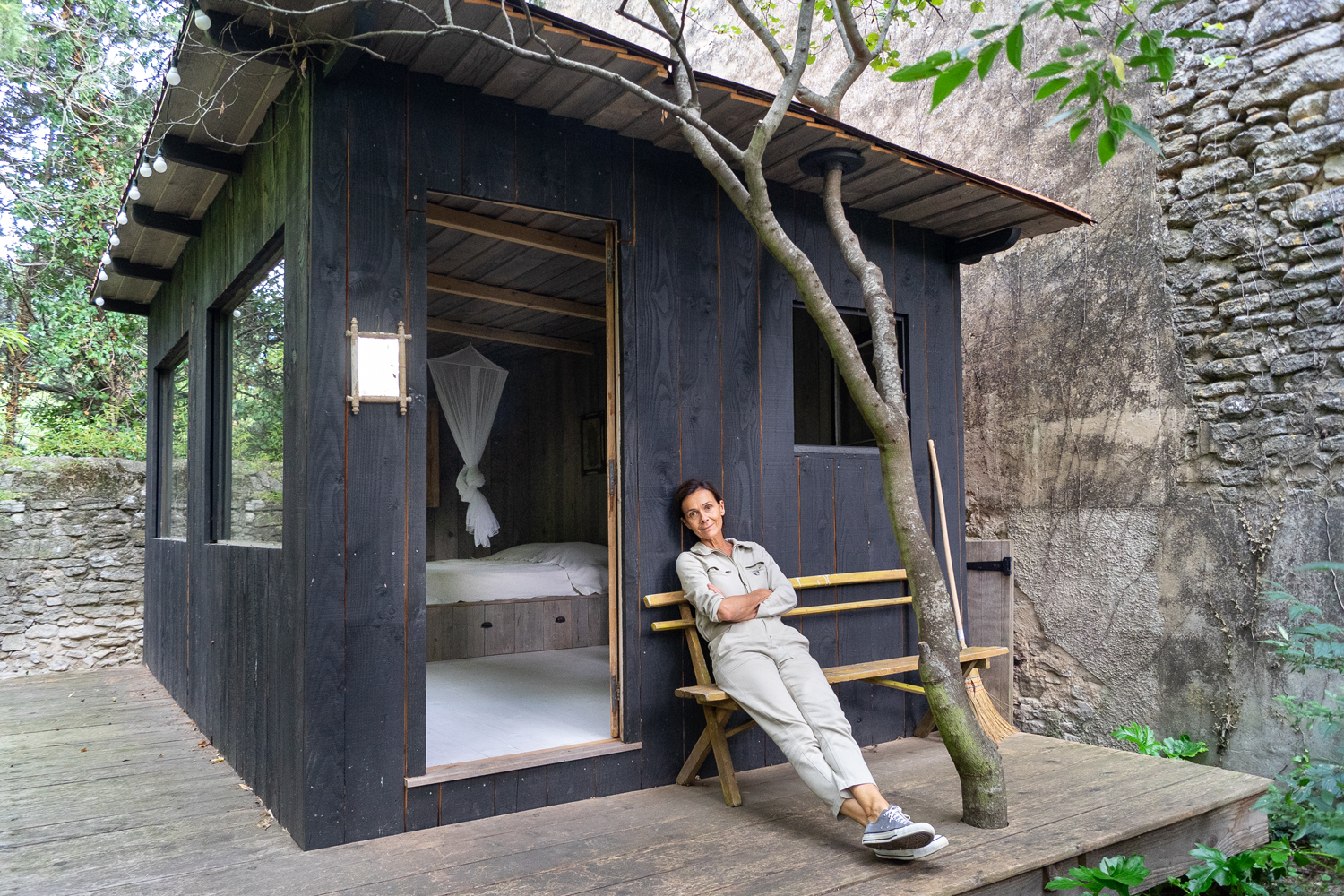 Christine prend beaucoup de plaisir dans le jardin. À Goult, elle a construit une cabane d’inspiration japonaise. Ici, elle peut profiter de moments méditatifs. Le plaqueminier produit des fruits miraculeux en hiver et les cuisines extérieures, omniprésentes en Provence, offrent des espaces doux pour les repas en plein air…