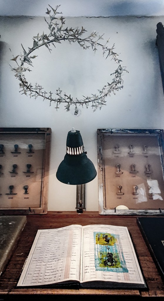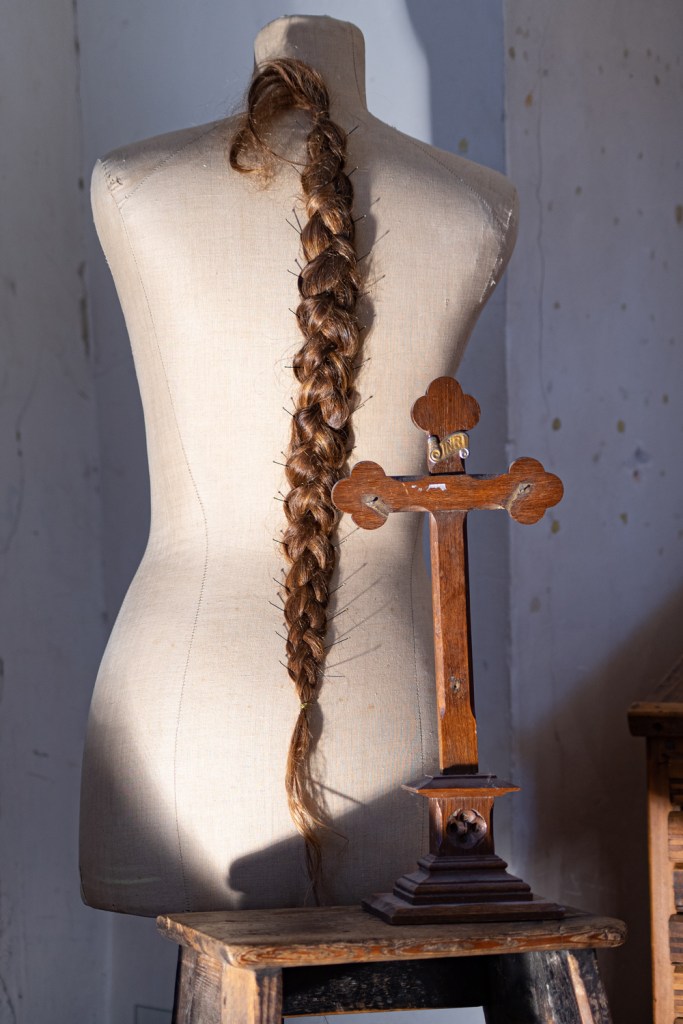 Au fil des ans, Christine F a transformé cette maison de trois étages, endroit où les os et les âmes briseés avaient été reconstitués et plus récemment où de jeunes esprits français avaient été instruits, en un «Cabinet de curiosités». La maison et l’atelier se sont fusionnés en créant un monde de la pensée et de l’art imaginaire et surprenant: un kaleïdoscope où se mêlent des broderies au fil d’or, où des myriades de lumières se sont transformées en sculptures en fil de fer, où des armoires regorgent de curiosités telles que des lettres anciennes magnifiquement écrites à la main, des reliques de dévotion, des cartes postales, des cadrans de montre, des scapulaires, des chapelets , des crucifix, des crânes, des cheveux humains et des cages à oiseaux.
