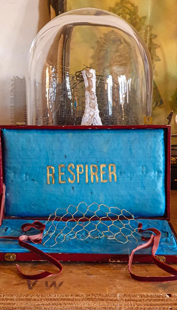 Isolation Creations: “RESPIRER” (pour respirer) fil peint en or, masque en grillage et ruban de velours et