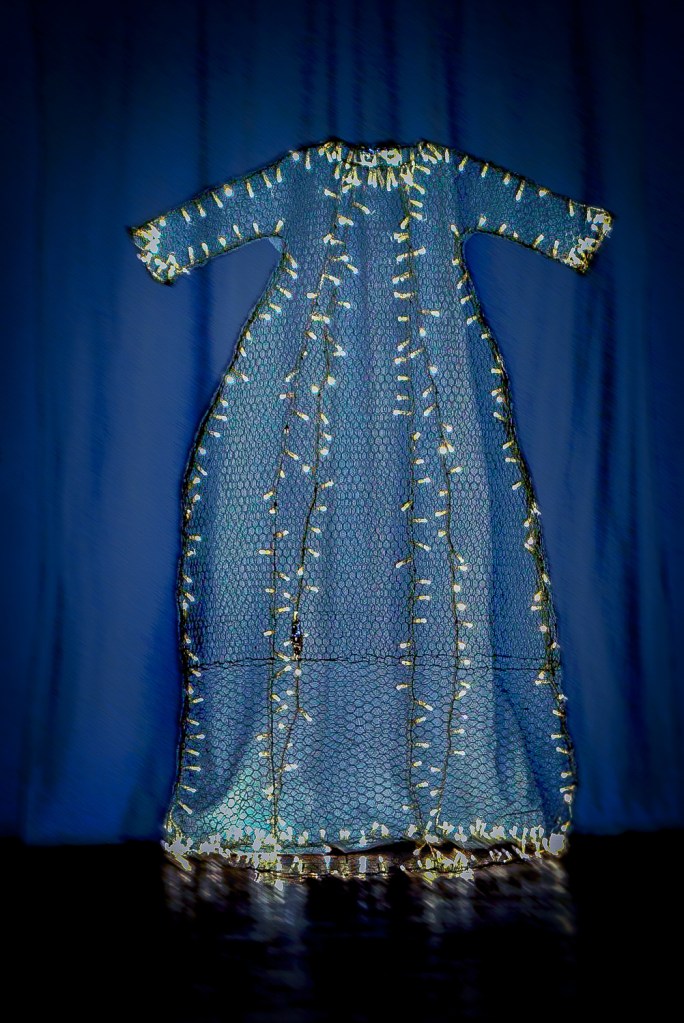 pour une robe de brindille; «Et une sculpture grandeur nature« GRAND CORPS ABSENT » réalisée à partir de grillage à poule et de guirlandes lumineuses.